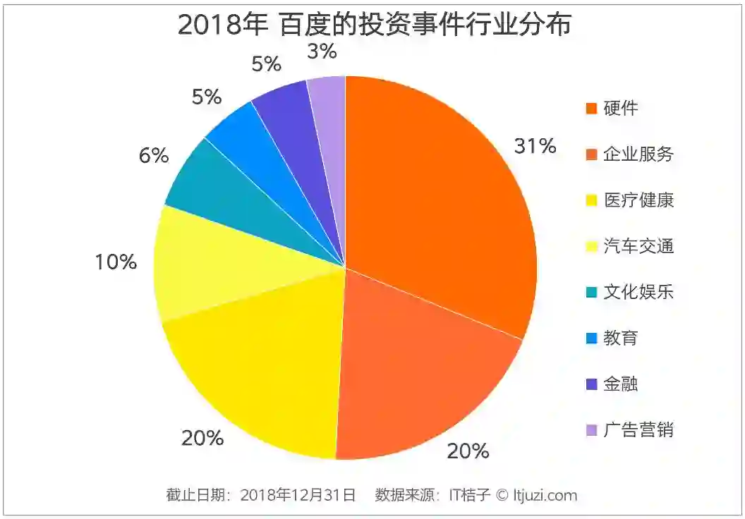 从行业分布来看,百度在硬件、企业服务、医疗健康、汽车交通、文化娱乐 TOP5 行业的投资事件占比超过 85%,可见行业集中度非常高。