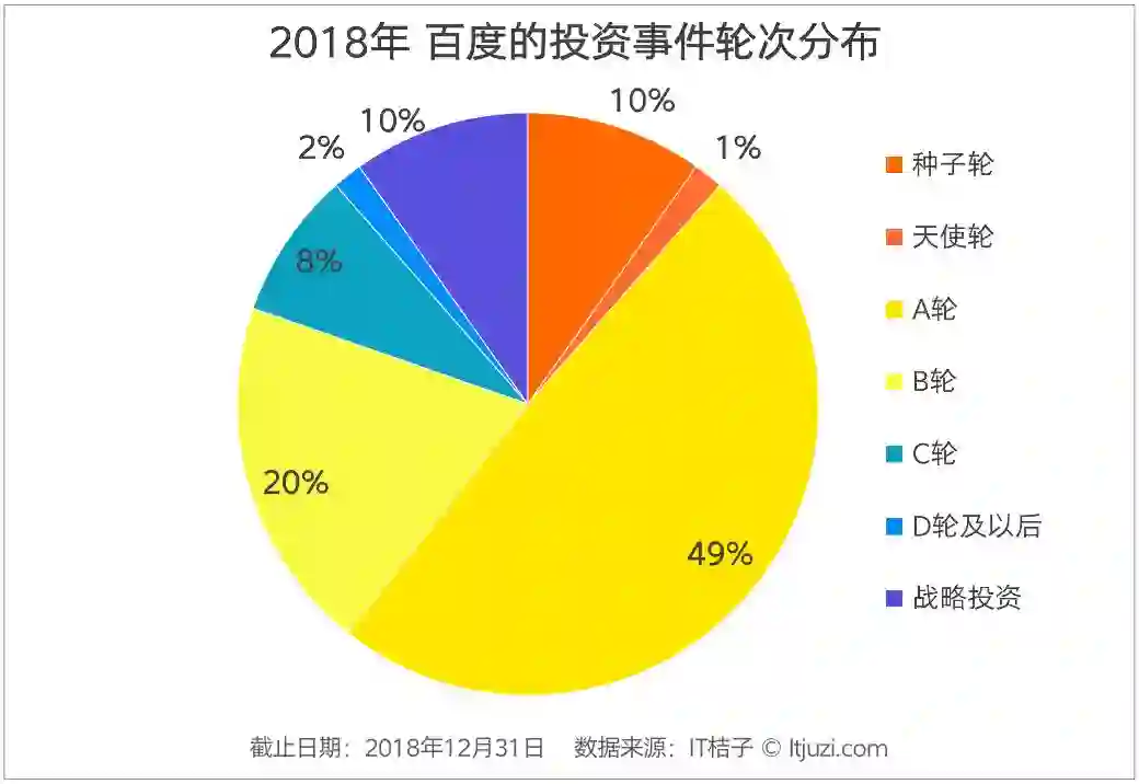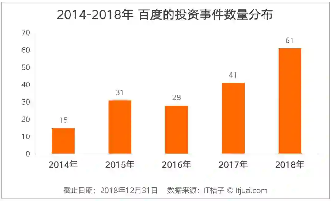 截止到 2018 年 12 月 31 日,IT 桔子追踪到百度 2018 年投资事件数量达到 61 起,投资活跃度相比 AT 差距非常明显,还不到他们的一半。