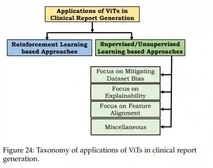 最近,利用深度学习技术从医学图像中自动生成临床报告取得了巨大进展[335]-[338]。这种自动生成报告的过程可以帮助临床医生做出准确的决策。然而,由于不同放射科医生报告的多样性、长序列长度(不像自然图像标题)和数据集偏差(与异常数据相比,更多的是正常数据),从医学图像数据生成报告(或标题)具有挑战性。此外,一个有效的医学报告生成模型有望处理两个关键属性:(1)语言流利性,便于人类阅读(2)临床准确性,以正确识别疾病及相关症状。在本节中,我们将简要描述变压器模型如何帮助实现这些预期目标,并有效地缓解前面提到的与生成医疗报告相关的挑战。具体来说,这些基于transformers的方法在自然语言生成(NLG)和临床疗效(CE)指标方面都取得了最先进的性能。还要注意的是,与主要讨论ViT的前几节不同,在本节中,重点是将transformer作为一种强大的语言模型来利用句子生成的长期依赖关系。由于其潜在的训练机制不同,我们将基于Transformers的临床报告生成方法大致分为基于强化学习(RL)和有监督/无监督学习方法,如图24所示。
