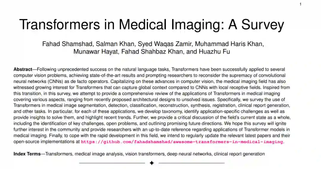 围绕Transformer的模型架构是当下大家关注的焦点!阿联酋阿布扎比大学发布了首篇《Transformer医疗影像》综述论文,41页pdf439篇文献全面阐述ansformers在医疗影像中的应用,涵盖了各个方面,从最近提出的架构设计到未解决的问题。具体来说,我们调研了Transformers在医学图像分割、检测、分类、重建、合成、配准、临床报告生成和其他任务中的使用。