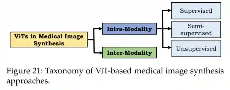 在本节中,我们将概述VIT在医学图像合成中的应用。大多数这些方法都包含了对抗性损失,以合成真实和高质量的医学图像,尽管代价是训练不稳定[314]。我们进一步将这些方法分为模态内合成和模态间合成。