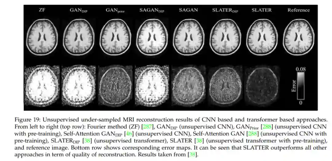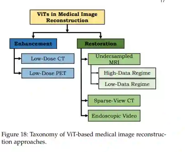 医学图像重建的目标是从退化的输入中获得一幅干净的图像。例如,从采样不足的版本中恢复高分辨率的MRI图像。由于其不适定性,这是一项具有挑战性的任务。在许多实际的医学成像场景中,精确解析逆变换是未知的。最近,VIT已被证明可以有效地应对这些挑战。我们将相关工作分为医学图像增强和医学图像恢复两个领域,如图18所示。