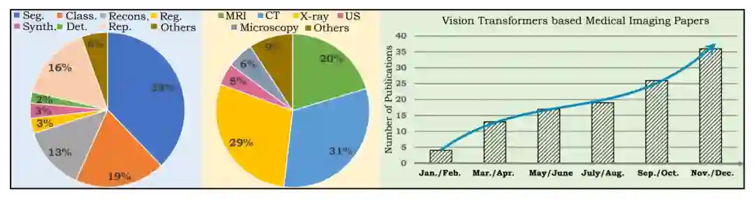 (左)饼状图显示了根据医学成像问题设置和数据模态所包括的调研论文的统计数据。最右边的数字显示了近期文献(2021年)的持续增长。Seg:分割,Class:分类,Recons:重建,Reg:配准,Synth:合成,Det:检测,Rep:报告生成,US:超声。