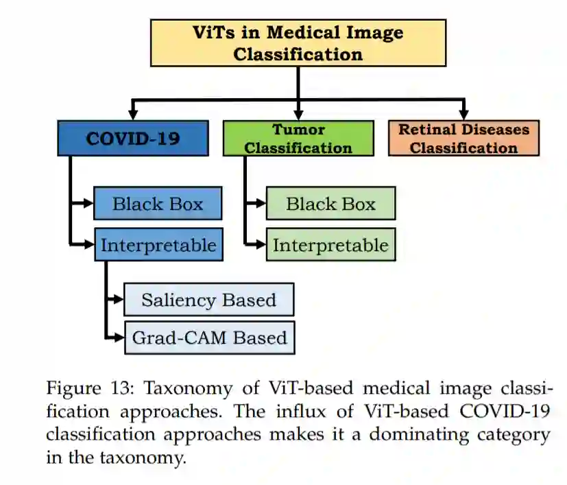 医学图像的准确分类是辅助临床护理和治疗的重要手段。本节将全面介绍VIT在医学图像分类中的应用。由于与这些分类相关的一系列不同挑战,我们将这些方法大致分为基于COVID-19、肿瘤和视网膜疾病的分类方法,如图13所示。