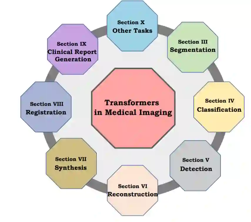 本综述涵盖了Transformer在医学成像中的多种应用领域