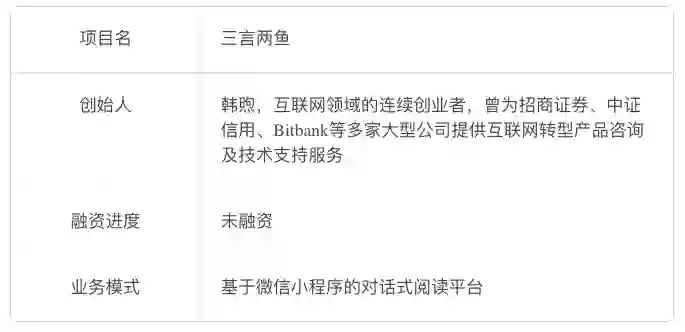 “三言两鱼”已启动150万元天使轮融资,预计出让股份10%。资金将主要用于提升内容生产能力、完善产品和依托微信进行推广。