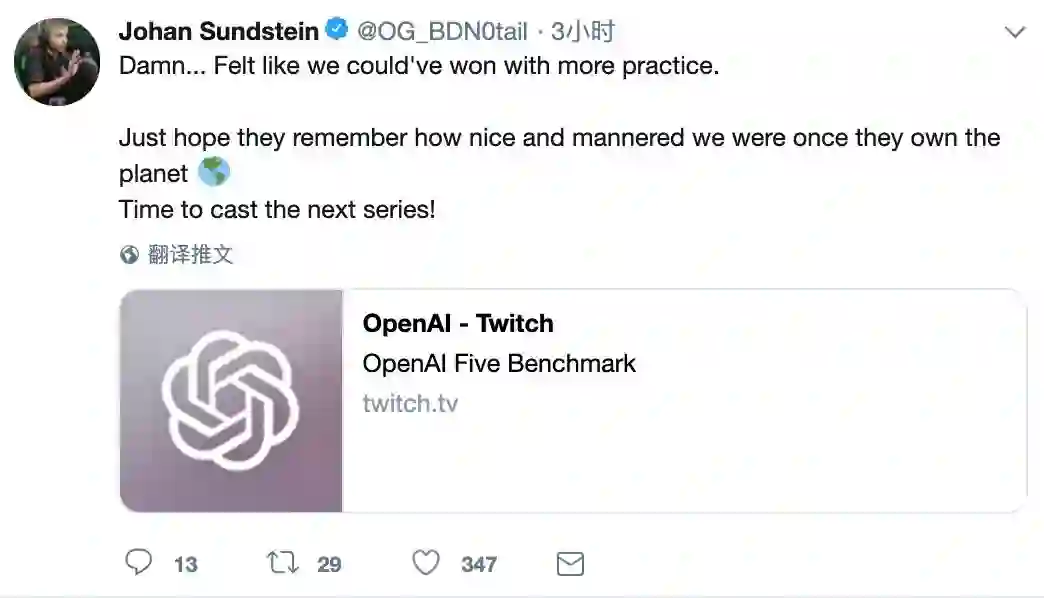 “靠,感觉我们注定赢不了,“OG 团队成员 Johan Sundstein 在输掉第二局后在Twitter说道,“一旦他们(AI)统治这个星球,希望他们(AI)能够记住,我们曾经多么善良有礼。”