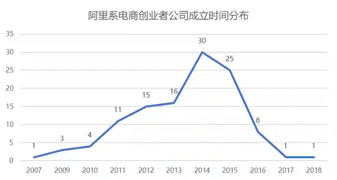 IT 桔子数据显示,阿里系电商创业热潮开始于 2011-2012 年,在 2014 年达到顶峰(当年新增 30 家创业公司),创业热潮在 2016 年起回归理性。2014-2015 年电商创业的火爆一方面是因为当时整个创投领域都处于高峰期;另一方面则是因为在阿里巴巴上市(2014 年 9 月 19 日)后,部分员工拿着套现的钱自行创业。
