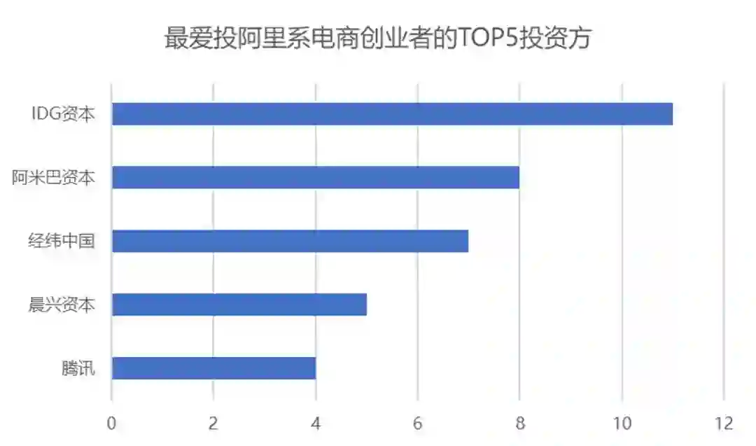从阿里系电商创业者的资本方背景来看,IDG 资本、阿米巴资本、经纬中国、晨兴资本和腾讯是最热衷投资阿里系电商创业者的 TOP5 机构。IDG 资本是最热衷投资阿里系创业者的机构,一共参与 18 起投资,涉及 11 家企业,其中多家企业是连续投资。