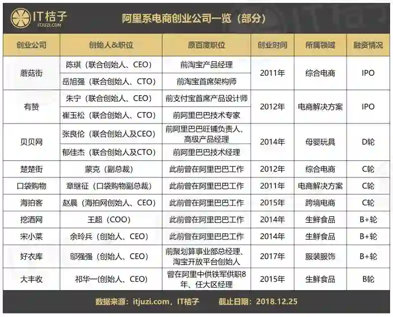 据 IT 桔子数据(不完全统计),截至 2018 年 12 月底,阿里系员工共创办了 115 家电商企业。
