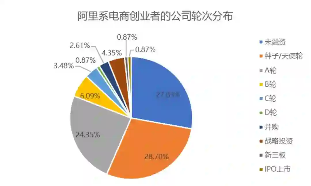 从获投机率来看,阿里系电商创业者拿到投资的比例达到 72%,等于说 10 个阿里人创业至少有 7 个能拿到融资。都说早期投资主要看人,可见大公司出来的创业者还是更容易拿到融资。