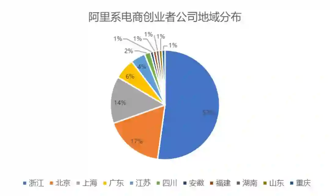 从地域分布来看,阿里系电商创业者大多选择去北上广深杭等沿海一线城市创业,占比接近 90%。其中,浙江省是阿里系电商创业者的首选,占比超过一半。由于阿里巴巴的总部在杭州,因此该地区创业项目数量最多也是非常正常的。
