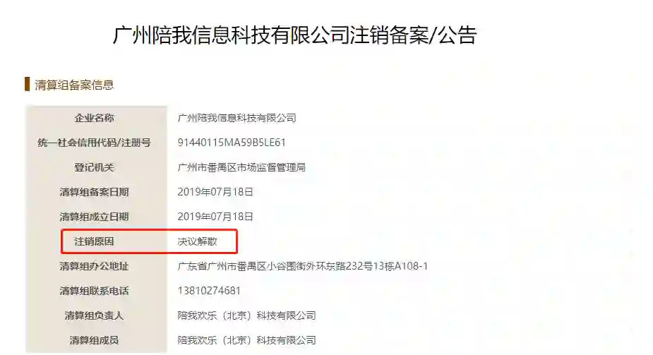 更惨的是,陪我的主体之一 “ 广州陪我信息科技有限公司 ” 前两天已经决议解散。。