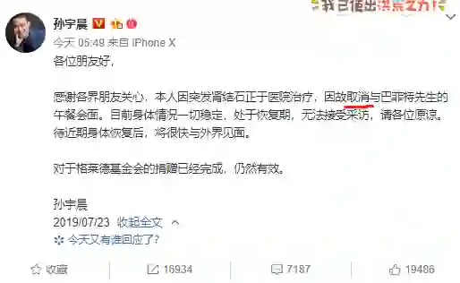 所以这次不能和巴菲特去吃饭真的是因为肾结石么?