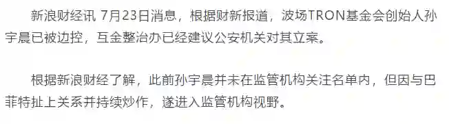 果然,刚刚新浪财经发文:“ 孙宇晨被边控了! ”(凤凰网科技注:该消息目前无权威来源,有待证实)