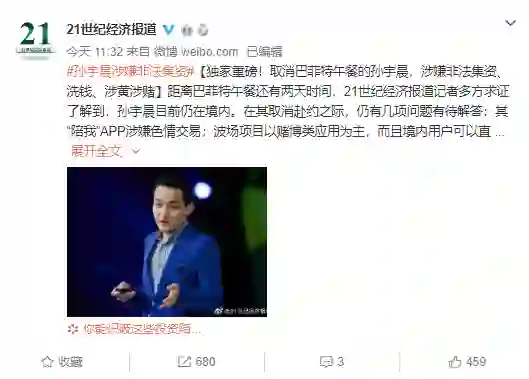 21世纪经济报道,《重磅!取消巴菲特午餐的孙宇晨,涉嫌非法集资、洗钱、涉黄涉赌》