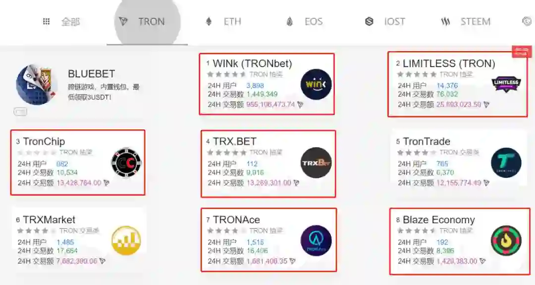 而这些交易额排名前几的应用,也就是红框框起来的那些,都是属于 TRON 抽奖类。