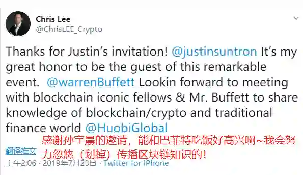 凌晨 1 点的时候孙宇晨还在通过 Twitter 告知大家他邀请了火币的 CFO Chris Lee 共同赴宴来着。