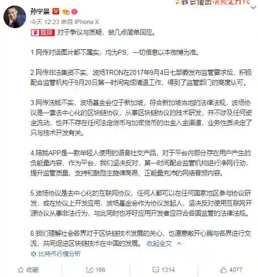 孙宇晨躺尸病中惊坐起,立马怼回去,总结起来就是公关回应六字真言:“ 甩锅、假的、不认 ”