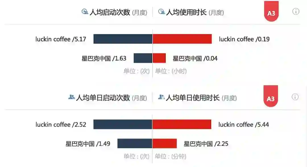 瑞幸咖啡、星巴克中国APP人均使用行为对比