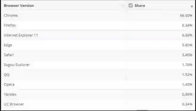 7月份额报告显示,68.60%的份额远高于排名第二火狐浏览器的8.34%,而第三的IE 11是6.86%,简直就是一家独大。