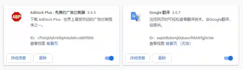 小雷常用插件是 Adblock 和 Google 翻译,就是下面这俩玩意儿。
