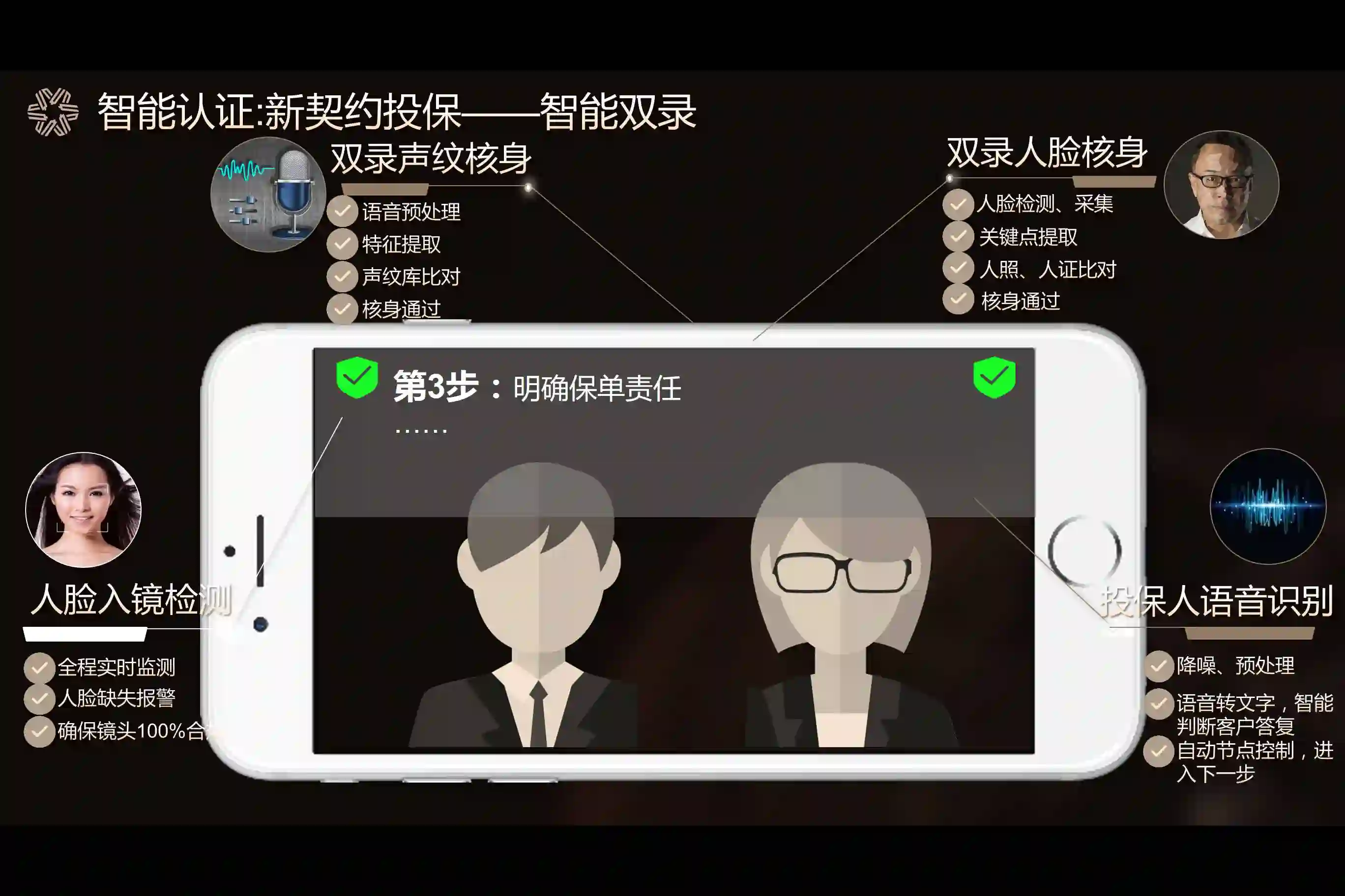 智能认证把投保时间缩短30倍,大幅提升代理人的生产力;在“新契约投保”中首创投保人+代理人实时“智能双录”,代理人须严格遵循操作流程,用户如不同意可随时喊“Cut”中止认证进程,质检成功率提升65%,这大大降低保险公司运营成本,同时保留了可资调取的一手大数据。这一“入口端”的创新从“保单制”升级为“实人制”,在全球保险业中尚属首次。