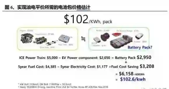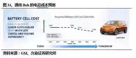 通用汽车在 2015 年曾经披露过 Bolt 电动车采用 LGChem 的电池,电芯 cell 的价格为 145 美元/kWh 左右。在年度全球商业会议上,通用汽车进一步对外展示了 Bolt 的电池电芯 cell 的成本预测。其中 2016 年的成本为 145 美元/kWh,这个数值持续到2019 年,2020 年会下降到 120 美元/kWh。到 2022 年,该数值继续下降到 100 美元/kWh。合理推算得到通用 bolt 电池组成本在 200 美元/kWh,到 2020 年降至 170美元/kWh。