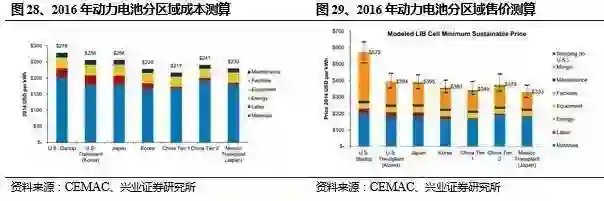 根据 CEMAC 的测算,由于在劳动力成本与材料成本上的优势,截止 2015 年底,中国动力电池不论在成本还是在售价上均已处于全球最低水平。考虑到今年以来本土电池掀起的新一轮降价潮(20% 降幅),成本已经成为中国动力电池的核心优势所在。未来动力电池产能持续向中国转移是大趋势,而中国也将成为世界的动力电池工厂,培育出一批具备国际竞争力的动力电池龙头企业。