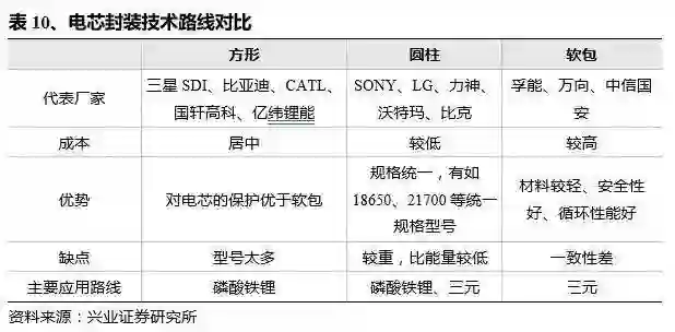 电芯封装方式按软包、方形与圆柱分,成本也有所区别。其中,圆柱最低,软包最高。主流大厂中 CATL 与比亚迪走方形路线,力神、比克走圆柱路线,国轩高科同时走方形与圆柱路线,同时 CATL 也在积极拓展软包路线。