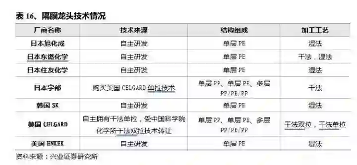 国产隔膜距离海外一线龙头仍有差距。日本的旭化成是隔膜行业的龙头,市占率在 50% 以上。过去 1-2 年,中国还有不少企业进入市场,但无法对龙头地位构成撼动。旭化成干法现在可量产出货的是 12 微米,湿法还是 6-7 微米。由于原料、技术、工艺与制备设备的差距,目前国产隔膜一致性较差,且厚度无法达到要求,干法 20-40 微米仍为主流。