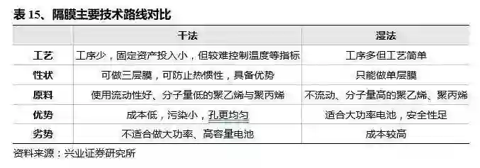 隔膜工艺主要分干法与湿法两类。隔膜的性能决定了电池的界面结构、内阻等,直接影响电池的容量、循环以及安全性能等特性,性能优异的隔膜对提高电池的综合性能具有重要的作用。隔膜技术路线主要分为干法与湿法两种,干法成本较低但不适合大功率电池,湿法更薄能够满足大功率的要求,但是成本较贵。最早的主流是干法,2015 年三元产量上升后湿法使用较多,预计 2020 年干湿法占比 50%,分别应用于中低端与高端领域。