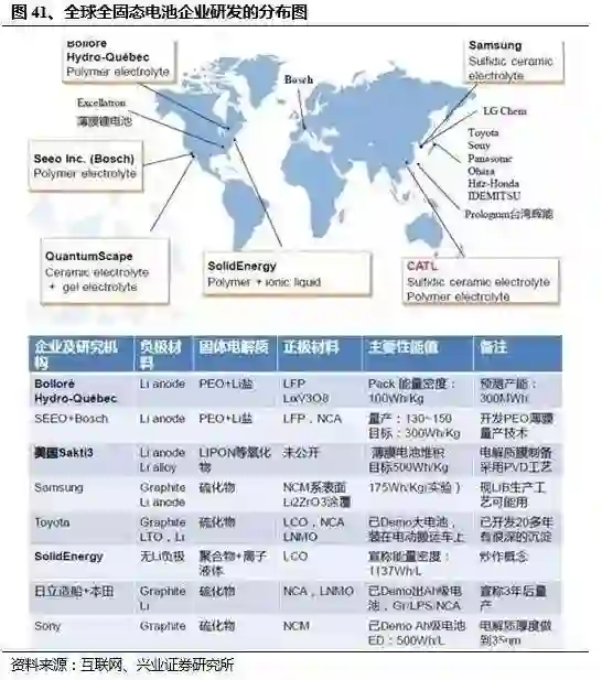 固态电池:高比能量+不燃烧。工作原理上固态锂电池和传统的锂电池并无区别,只是电解质从液态变为固态。固态电池的优势在于:1)能量密度:固态电池不再使用石墨负极,而是直接使用金属锂负极,大大减轻负极材料的用量,使得整个电池的能量密度有明显提高。目前实验室已经可以小规模批量试制出能量密度为 300-400Wh/kg 的全固态电池。2)安全性:固态电池不会在高温下发生副反应,不会因产生气体而发生燃烧。目前丰田、松下、三星、三菱以及国内的宁德时代等电池行业领军企业都已经积极布局固态电池的储备研发。