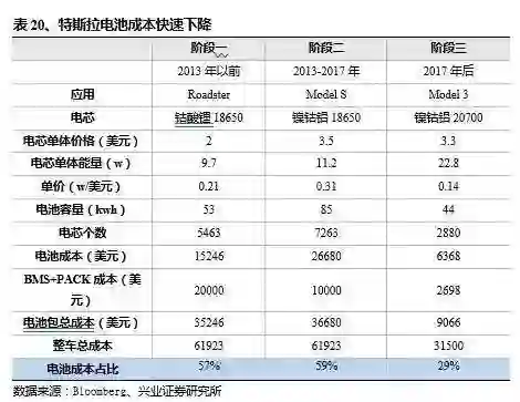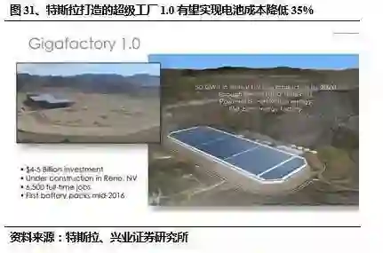 特斯拉的电池成本主要分为三个阶段,目前电池成本占比接近 60%,未来投资 50 亿美金的超级电池工厂投产,成本有望下降 30% 以上。
