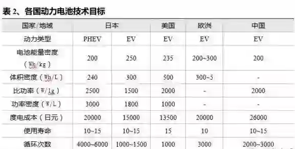 日本、美国与中国均提出到 2020 年实现电池性能的大幅提升与成本的大幅下降,中国目标为 1 元/WH;
