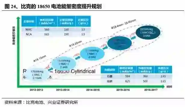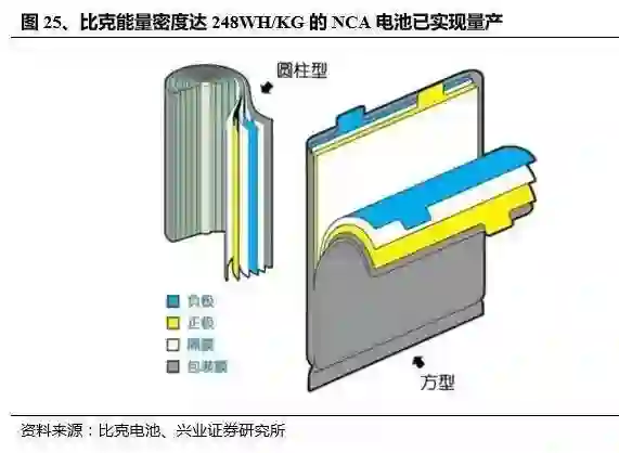 本土三元龙头企业正在加速实现高比能三元电池量产。以本土高比能电池的代表企业比克电池为例,其 16 年三元出货量 0.9GWh,在本土企业中位列第 2,仅次于 CATL,其商业规划具备一定代表性。根据其规划,比克的 NCM 与 NCA 电池量产计划齐头并进,目前能量密度达 248WH/KG 的 NCA 电池已实现量产,而下一代 285WH/KG 的 NCA 电池将于年内量产。就能量密度来看,已经达到特斯拉与松下水准。