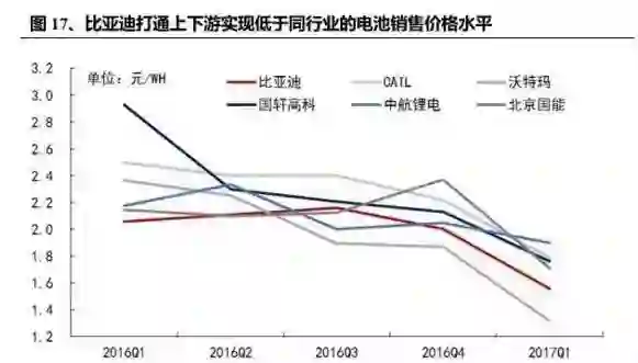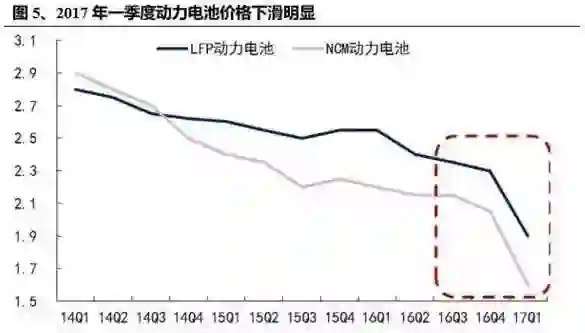 补贴退坡敦促全产业降成本,动力电池首当其冲。2016 年 12 月 30 日,新版补贴政策正式落地,乘用车、专用车补贴退坡 20%,客车退坡 30%-50%。此外国补与地方补贴配比普遍由此前 1:1 下调至 1:0.5,整体补贴退坡幅度较大。补贴下调使得动力电池环节首先受到冲击,一季度销售价格下滑明显,对毛利率造成一定冲击,电池企业短期内压缩成本的意愿十分强烈。此外,新一轮补贴退坡将在 2019 年到来,率先实现降成本的电池企业将在一年半后的再次退坡中占得先机。