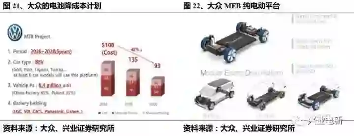 大众的 MEB 平台是其电池组未来实现成本大幅下降的关键。以大众为例,大众的针对电动车专属研发的 MEB(MEBElectrictoolkit)平台是以大众目前的 MQB 平台为基础,适用于电动车的全新的模块化平台。MEB 平台的构架是由底部的电池组而展开,打造更长的轴距和更短的前后悬,营造出更大的内部空间,从 A 到 C 级全系列乘用车或轻型商用车都可基于该平台打造。电池组 PACK 与 BMS 设计也根据平台打造,根据不同车型仅需要做一定的修缮与升级,设计与研发成本被最大化的摊薄。