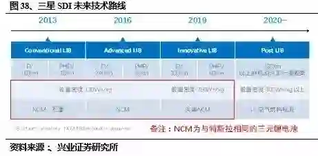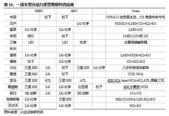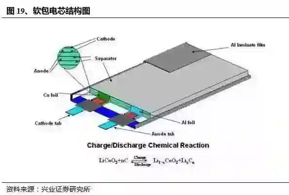 兴业证券对三款最为主流的车型电池组进行剖析,而这三款电池也正好对应三家日韩巨头电池企业,松下、LG 与三星;以及三种主要的封装形式,圆柱、软包与方形路线。