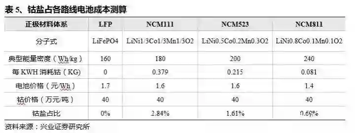 预计钴价上涨对三元电池影响有限。虽然目前高镍三元材料市场份额逐步提高,但绝大部分厂商已进入从 532 向 622 转移的阶段,未来过渡到 811 后,单位用钴量将明显减少。根据前述测算,高镍 NCM811 路线中钴盐占售价比不到 1%,因此未来高镍三元时代到来后,钴价上涨将不会对降成本起到太大影响。