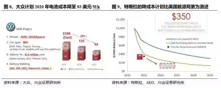 产业界龙头目标更为激进,特斯拉、通用与大众纷纷宣布降成本计划,2020 年目标最低低至 93 美元/KWH。