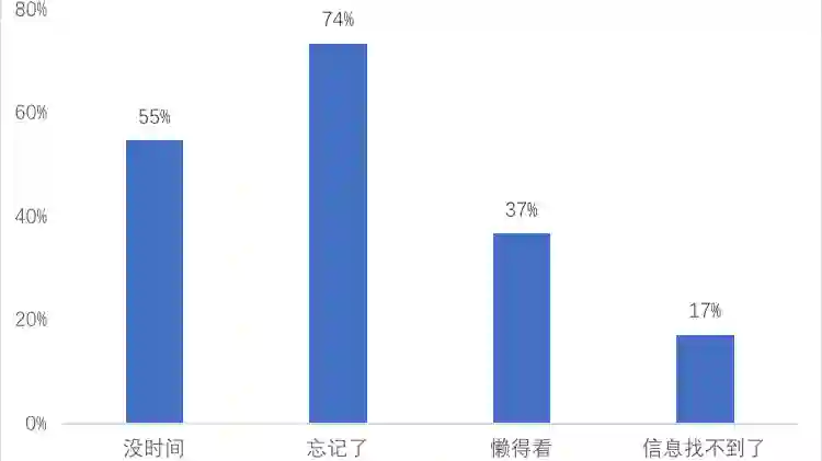 在 “囤积信息后不看” 的原因(图3)中,“忘记了” 是头号原因,也有超过半数人认为“没时间”也是原因之一,还有近四成的学生表示回看那些信息“很麻烦”、“懒得看”。