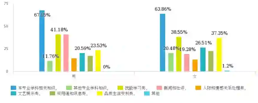 男女生收藏之后更愿意看的信息类型差异则较大,虽然大家都最愿意看本专业学科知识,但愿意看新闻社评信息的男生比例远高于女生,愿看品质生活安利类信息的女生比例也远高于男生。(图4、5)