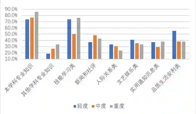 从图6中可以看出,心理压力大的学生,特别是重度心理压力的人,倾向于收藏本学科和其他学科专业知识、技能学习、新闻社评等严肃信息的比例高于心理压力程度轻的人。而心理压力程度轻的同学,收藏文艺娱乐类、品质生活安利类等信息的比例要更高。