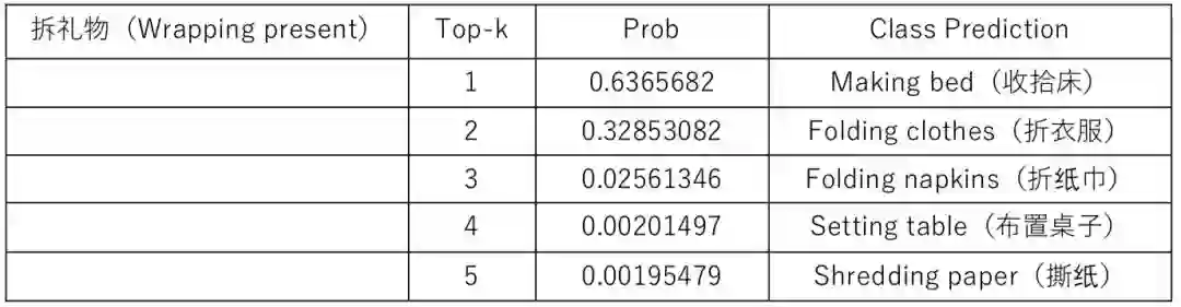 如表 1 和表 2 所示,第一列是官方视频分类标签,后三列显示了机器预测结果的前五个分类结果,按照置信概率将五个预测结果进行降序展示。显而易见的是第一个视频中的鼓掌动作行为还是被机器很好的预测了出来。至于第二个拆礼物行为,确实没有一个正确的预测结果,机器还比较充分的相信这是一个收拾床的行为,在这一点上,人类的识别准确率还是远高于机器识别的准确率。