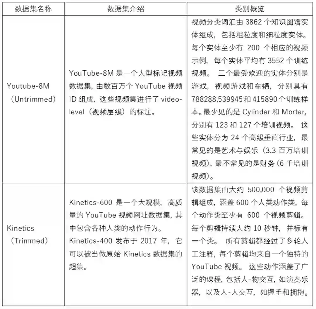 虽然网络上有大量用户上传的视频数据,但是这些数据大多缺少视频分类标签,如果直接拿过来使用进行训练会导致效果不佳。在学术届,通常会有一些公开的、已经打过完整标签的数据集来进行算法训练。对于视频分类领域,主要包含两大类数据集,一类是剪辑过的(trimmed),另一类是未剪辑过的(untrimmed)。前者是指经过剪辑的视频只包含待识别类别的内容;后者是指未经过剪辑的视频会包含除了动作/场景/物体之外的其他很多信息。