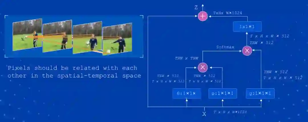 Nonlocal 是视频非局部关联建模模型,该模型通过引入类似 self-attention 机制,计算效果好,但是计算量大。图 5 为 Nonlocal 模型的框架结构。