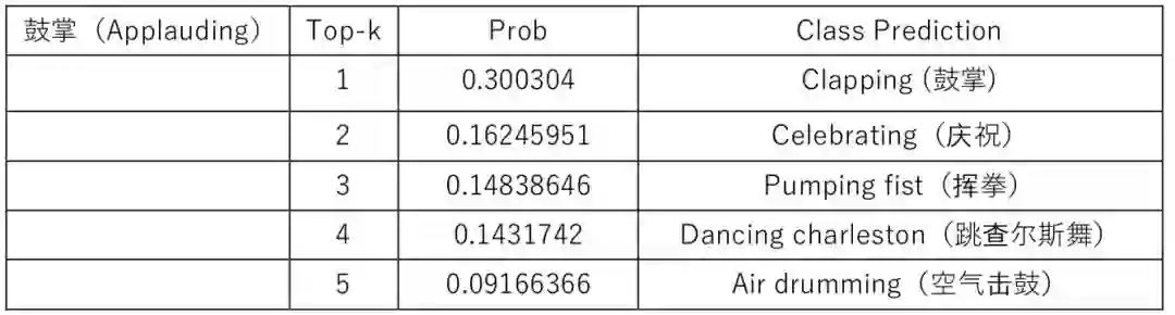 表 2:基于 Kinetics 数据集训练的 StNet 模型预测视频 2 的结果 Top5.