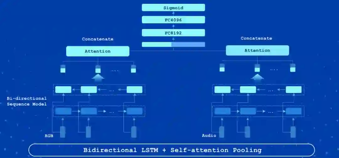 Attention LSTM 是视频分类中的常用模型,具有速度快精度高的特征。该模型采用了双向长短记忆网络(LSTM),将视频的所有帧特征依次编码。与传统方法直接采用 LSTM 最后一个时刻的输出不同,该模型增加了一个 Attention 层,每个时刻的隐状态输出都有一个自适应权重,然后线性加权得到最终特征向量。图 3 是 Attention LSTM 的框架结构。
