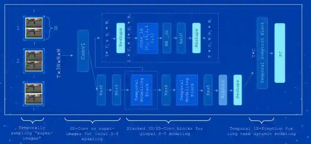 先来介绍百度的自研模型 StNet 模型、Attention Cluster 模型和 Attention LSTM 模型。其中 StNet 模型发表于 AAAI2019,由于拥有卓越的分类能力,它曾助力百度计算机视觉团队夺取了 ActivityNet Kinetis Challenge 2018 挑战赛的冠军。该模型提出“super-image"的概念,在 super-image 上进行 2D 卷积,建模视频中局部时空相关性。另外通过 temporal modeling block 建模视频的全局时空依赖,最后用一个 temporal Xception block 对抽取的特征序列进行长时序建模。该框架在动作识别方面优于一些最先进的方法,可以在识别精度和模型复杂性之间取得令人满意的平衡。图 1 为 StNet 模型的框架结构: